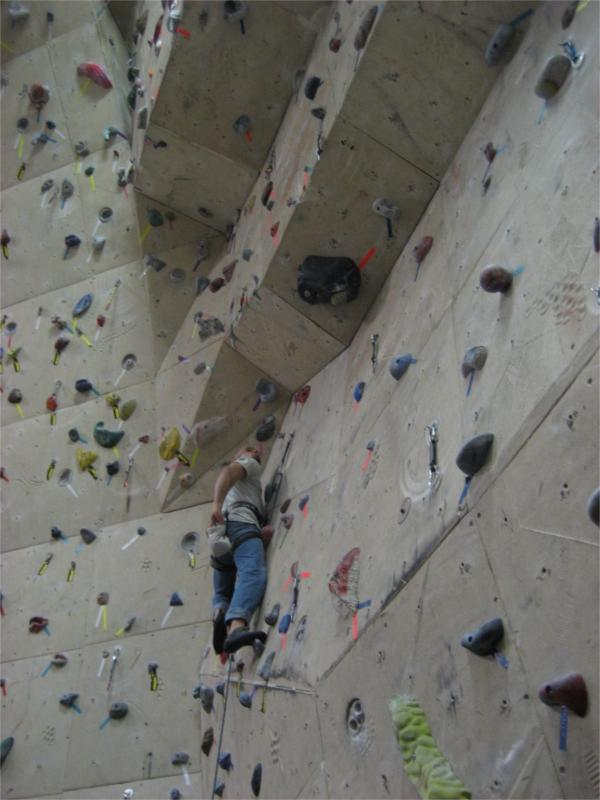 overtraining in many settings, and can be very hard to locate. Flash checked in B1 and B2, Lisa and Karl topped some routes in the small pit; just to make sure Richard wasn't hiding there. Eric and I peeked over a few roofs; no sign of him. Lisa had a great idea! She figured: if Richard was at the gym, the best way to lure him out would be to use a lead rope as bait. Lisa, Aaron, Flash, and Eric lead the blue route next to the small pit. We then went over to the walls by the arch, thinking that some more difficult climbs would draw him out; if he